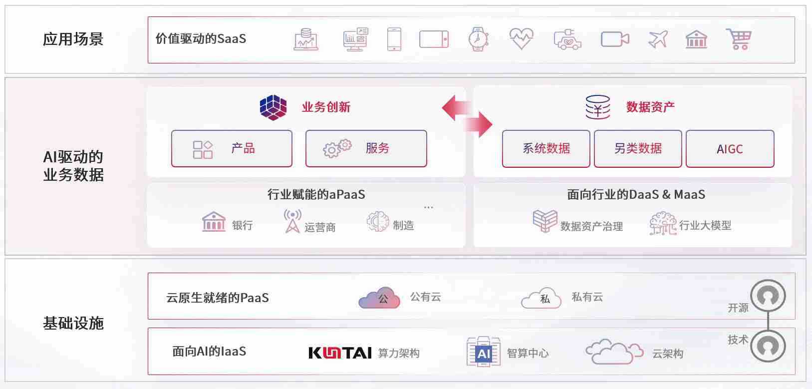 数字时代,,,围绕企业数字化转型的关键要素,,AG尊龙凯时数码开创性的提出数云融合战略和技术体系框架,,着力在云原生、、数字原生、、、、AI原生和信创产业上架构产品和服务能力,,,,为处在不同数字化转型阶段的快消零售、、汽车、、、金融、、医疗、、、政企、、、、教育、、、、运营商等行业客户提供泛在的敏捷IT能力和融合的数据驱动能力,,,,构建跨界融合创新的数字业务场景和新业务模式,,助力企业级客户建立面向未来的核心能力和竞争优势,,全面推动社会的数字化、、、智能化转型升级。。