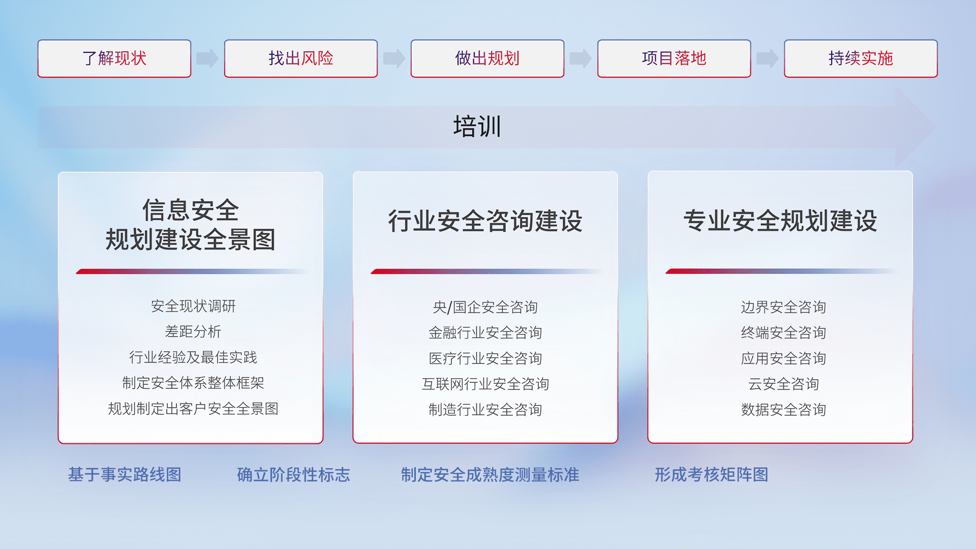 针对客户行业特性,,,,以专业的安全服务+多厂商联合解决方案提供专属的一站式安全管理服务,,,,帮助客户全面感知网络空间威胁,,,,基于识别、、、检测、、、分析、、、、防护、、、、监测、、、、响应的服务理论模型,,从方案咨询、、集成交付、、评估验证、、、、优化加固、、、运维运营,,,,致力于为客户提供完整的闭环管理式安全服务。。。。以实战经验为客户打造高抵御风险的安全体系,,,,帮助客户发现威胁、、对抗威胁、、、处置威胁,,不断积累安全对抗能力,,,持续保障数字化安全。。。。